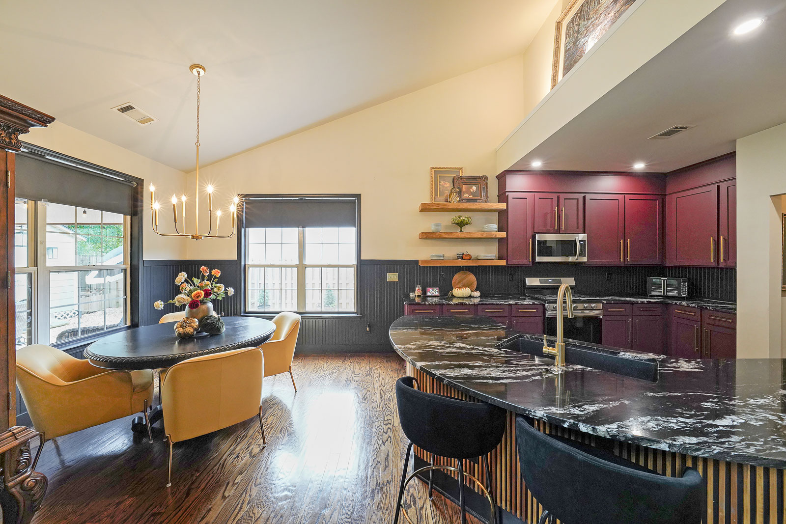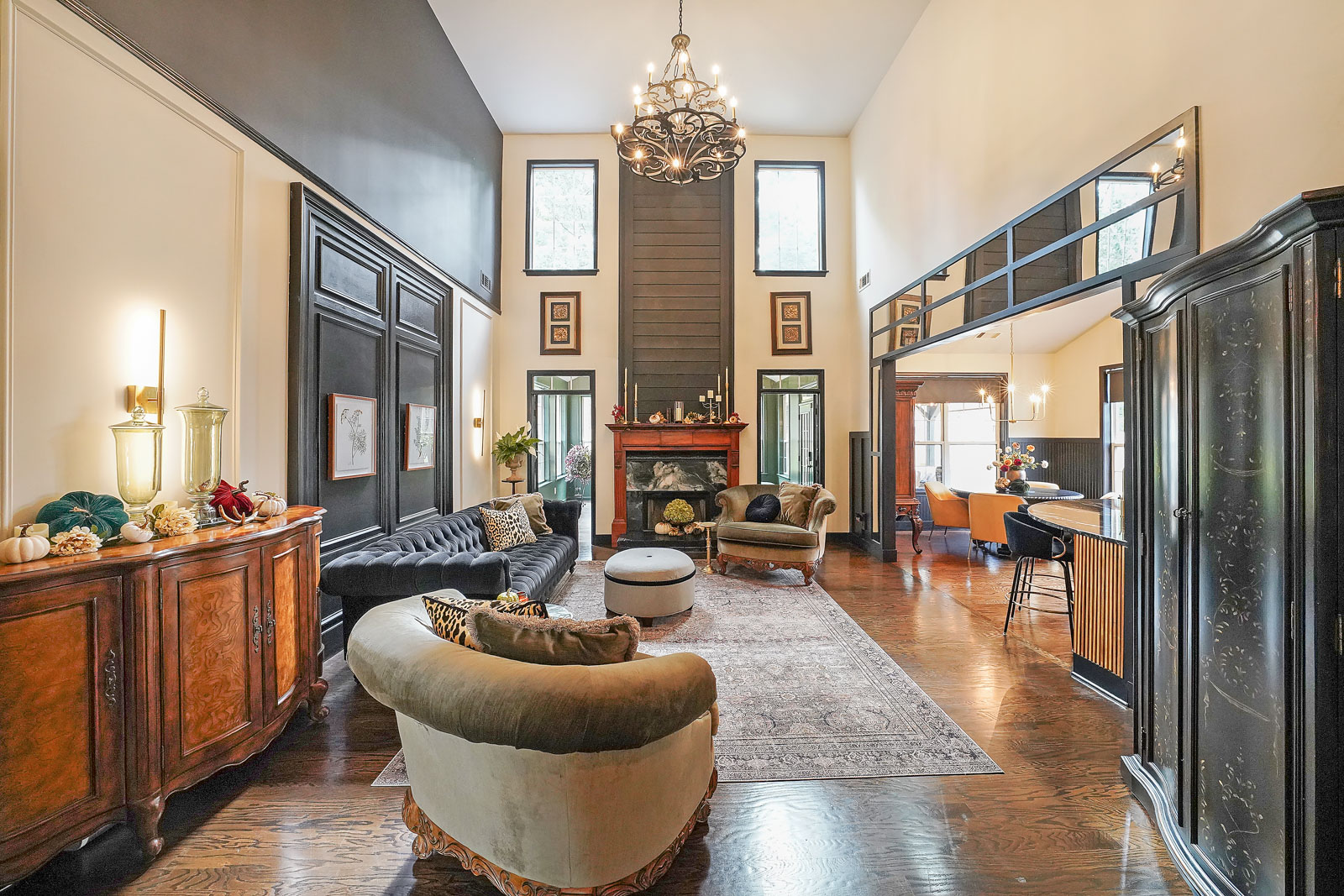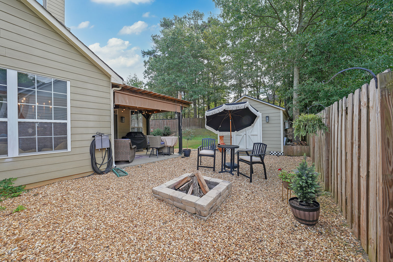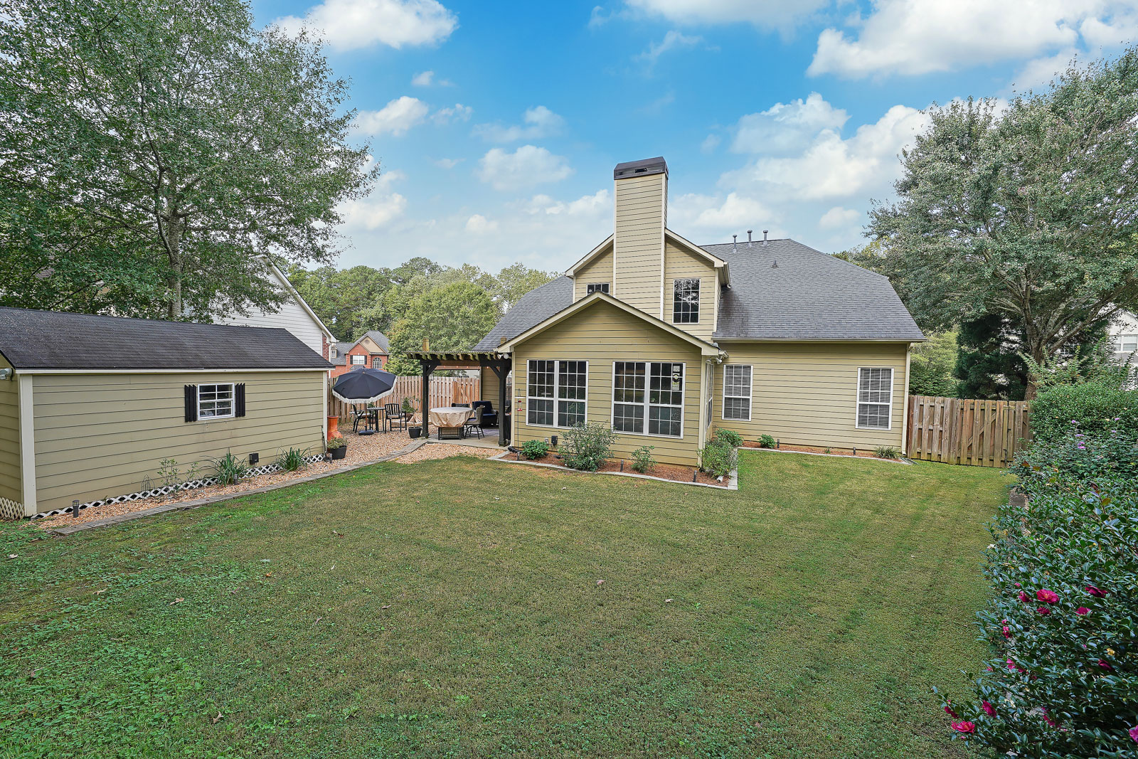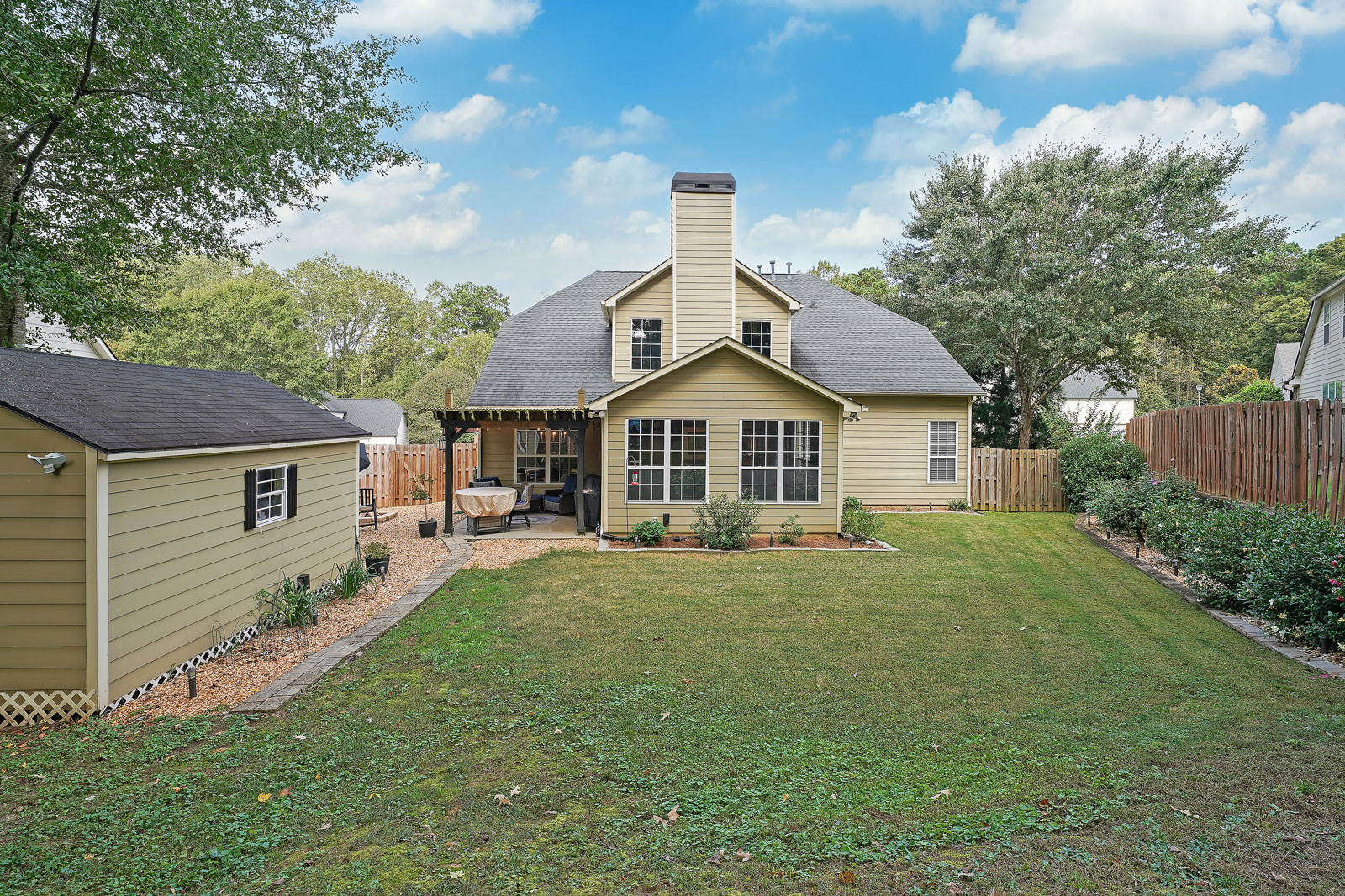 Walk in through the double door entry into your 2 story foyer. On the main level, the high ceilings continue into the family room area with custom moldings and a lovely wood burning fireplace, the added light filled sunroom would be the perfect place to relax with family and friends. The dining room offers an added custom wine bar that extends the length of the room with custom cabinetry and a beautiful built in fireplace. Walk through the gorgeous sliding double doors that lead into the den with a calming vibe, fireplace and large window to allow light to flow through the room. The kitchen has beautiful new stone counters, shelving, new appliances and is steps away from your built in coffee bar. The master bedroom is also on the main level and has brand new carpets, a fireplace, double door entry to your gorgeous en-suite bathroom with soaking tub, glass door tiled shower, double sinks and walk in closet. The backyard is fully fenced and offers an extended patio with pergola, a storage building to match the house with a new roof and plenty of room to entertain. Other upgrades include new lighting throughout, new wainscoting, new faucets in all baths and kitchen, new hardwoods, whole house filtration system, newly added insulation in attic, upgraded cabinetry and the back fence was extended 8 feet by back patio area. This home is an entertainers dream with a built in bar area, keg and beautiful wine fridge giving off a relaxing speakeasy vibe! The location can’t be beat! You are so close to restaurants, shopping, Mall of Georgia, Top Golf and more.